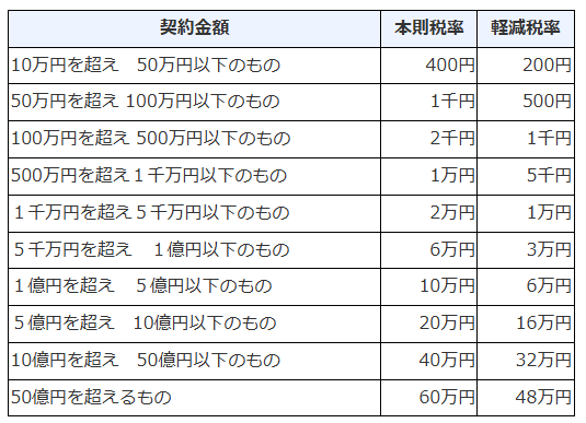 印紙税とは、国が定める課税文書に課される税金です。不動産売買の契約書は課税文書に該当するため、契約書に購入した印紙を貼り付ける必要があります。印紙の購入費用は以下の通りです。